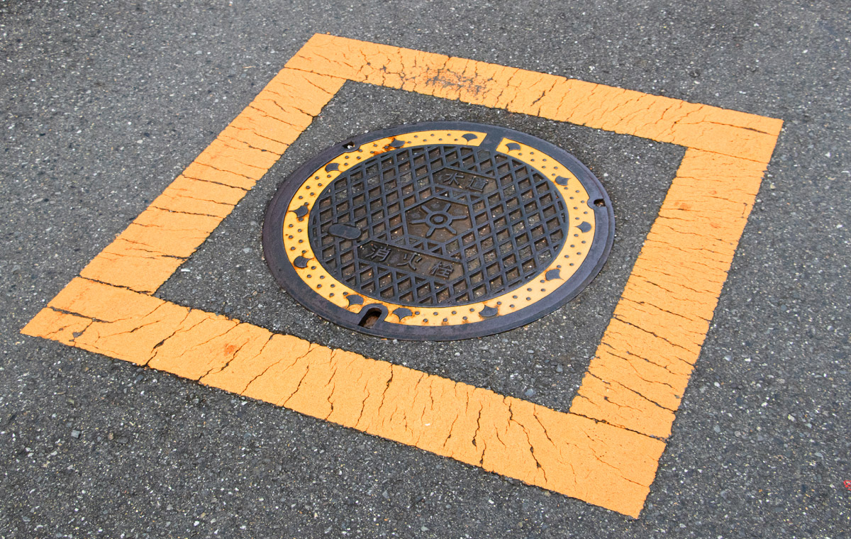 日本は国土が狭いため、消火栓の殆どが道路の地下に設置されています(地下式)。そこで、消防自動車が消火栓の位置を早く見つけるため、また、消火栓の近くに駐車されたり、 物を置かれたりするのを防止するために標識が建てられており、この標識を維持管理をする費用は、すべて標識に付属する広告料でまかなわれています。 [ 日本で最初の民活方式(1955年発足) ]